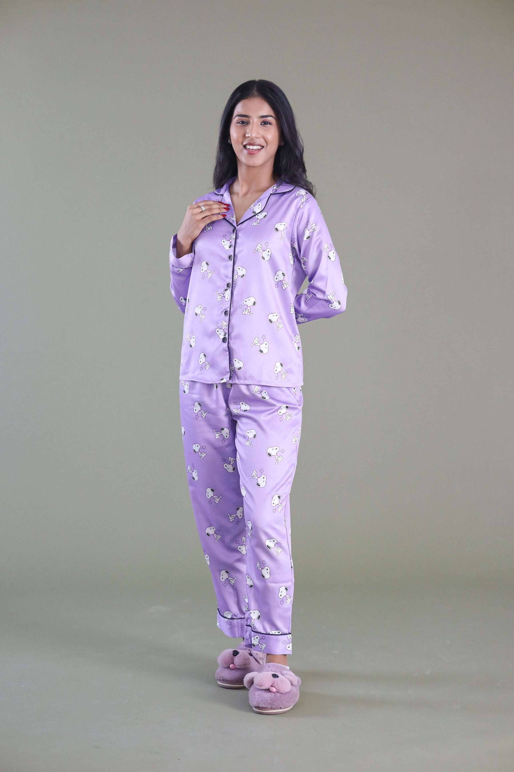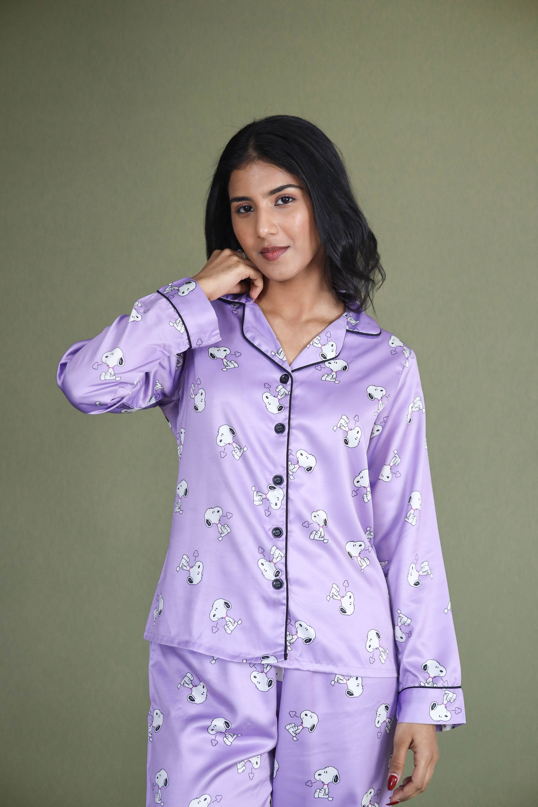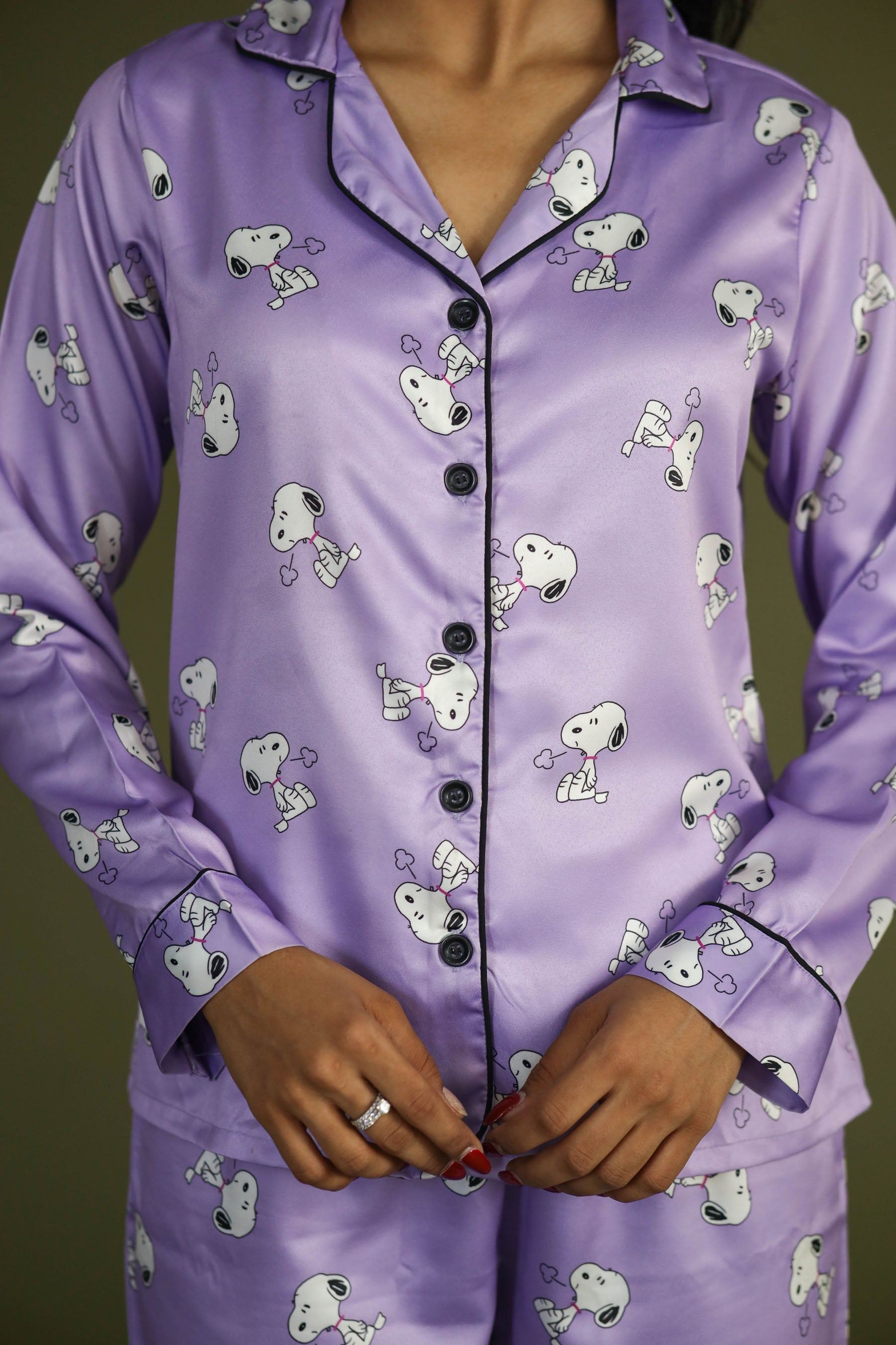 Women's Silk Satin Lilac Color Snoopy Print Full Sleeves Night Suit