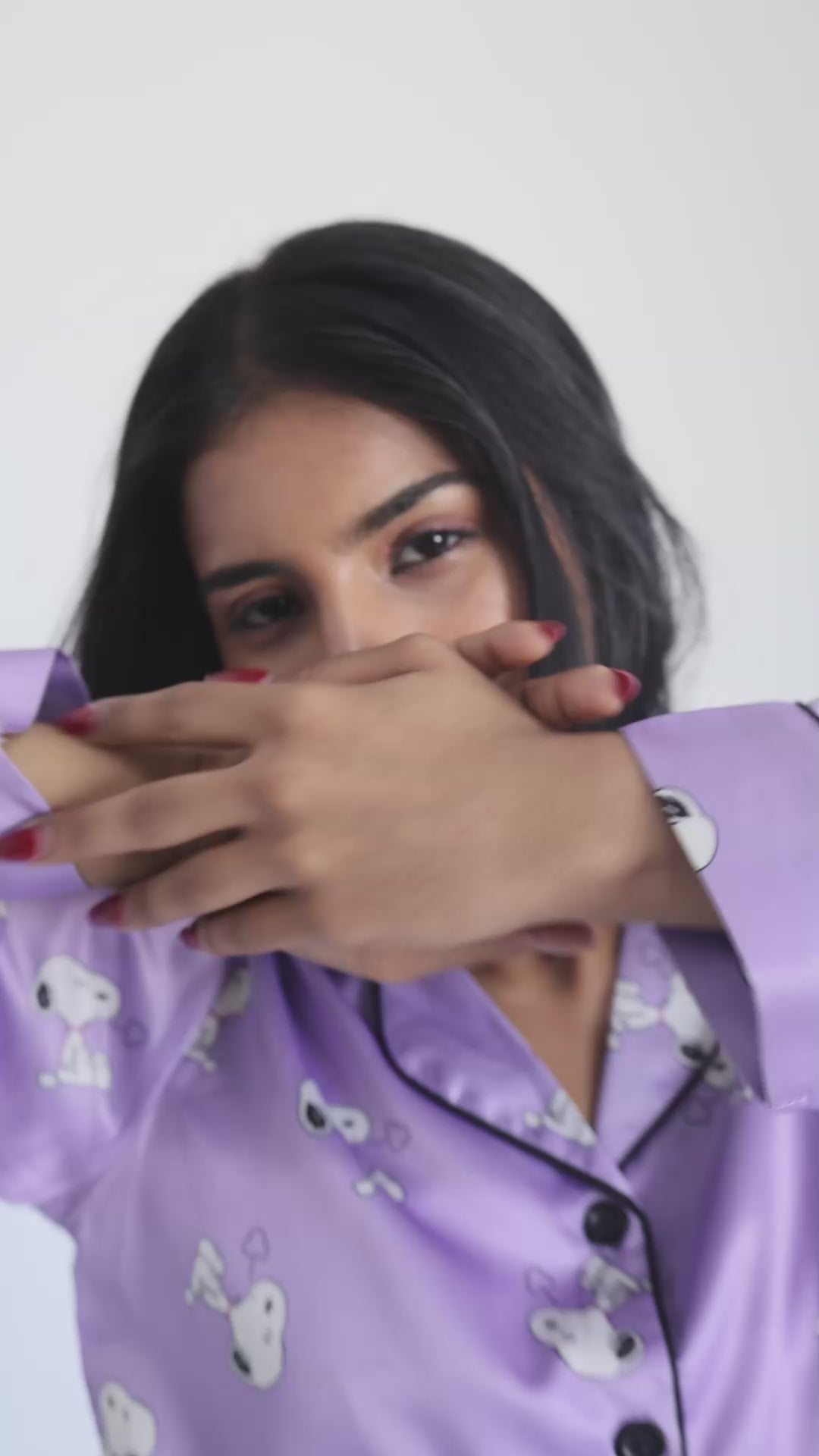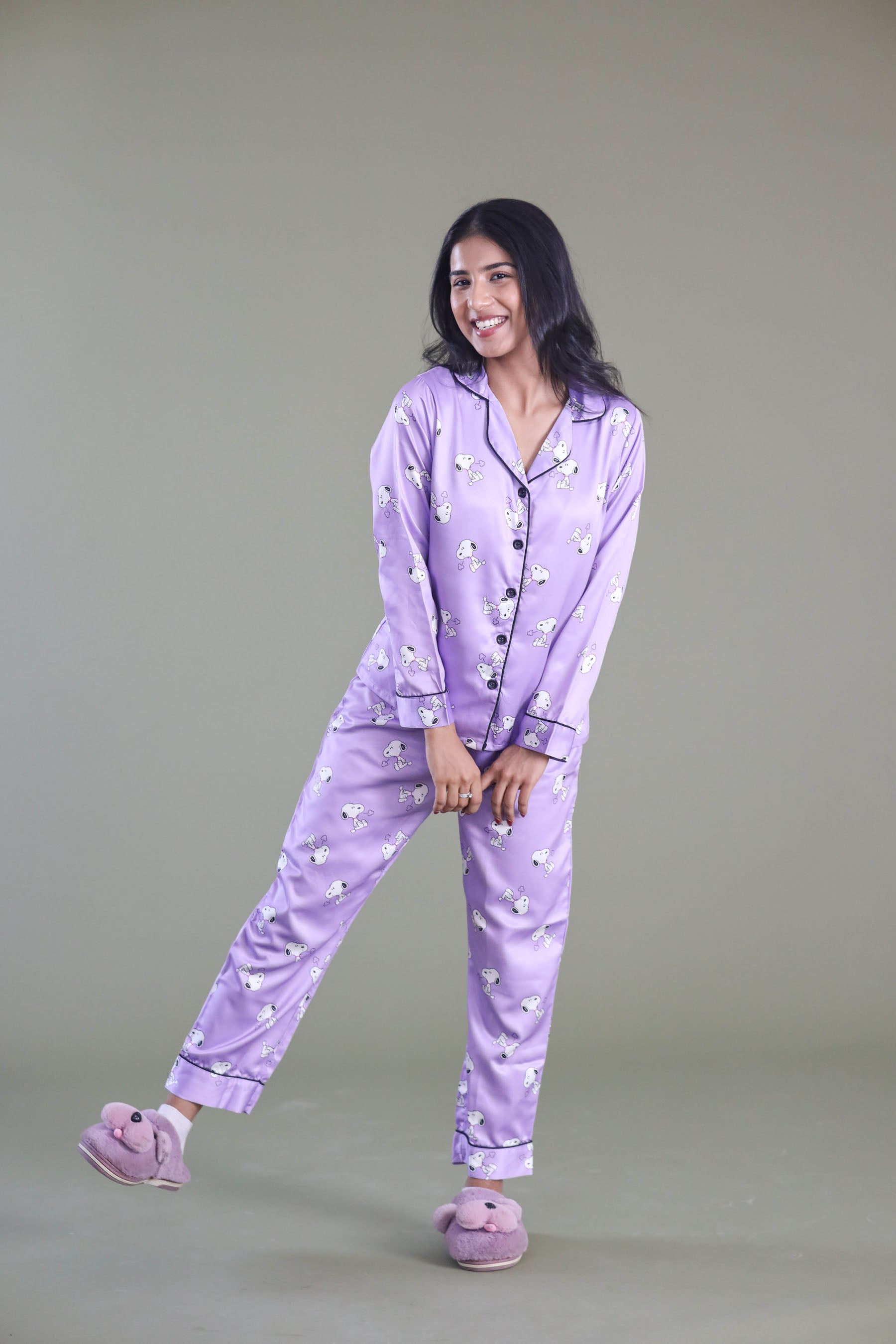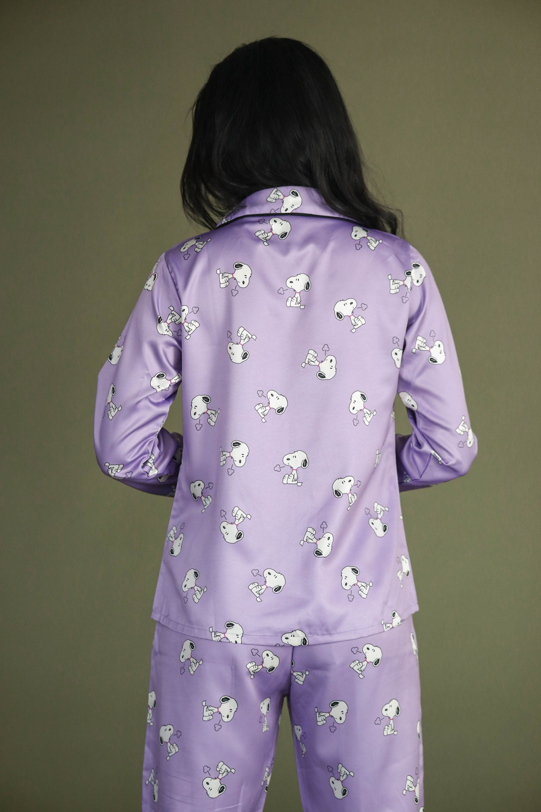 Women's Silk Satin Lilac Color Snoopy Print Full Sleeves Night Suit