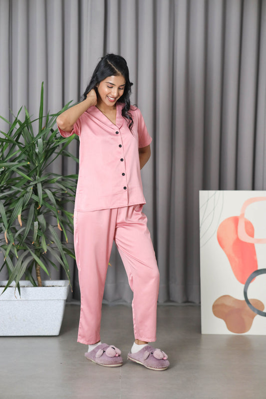 Women's Silk Satin Shoulder Collar Rose Gold Color Night Suit Pair