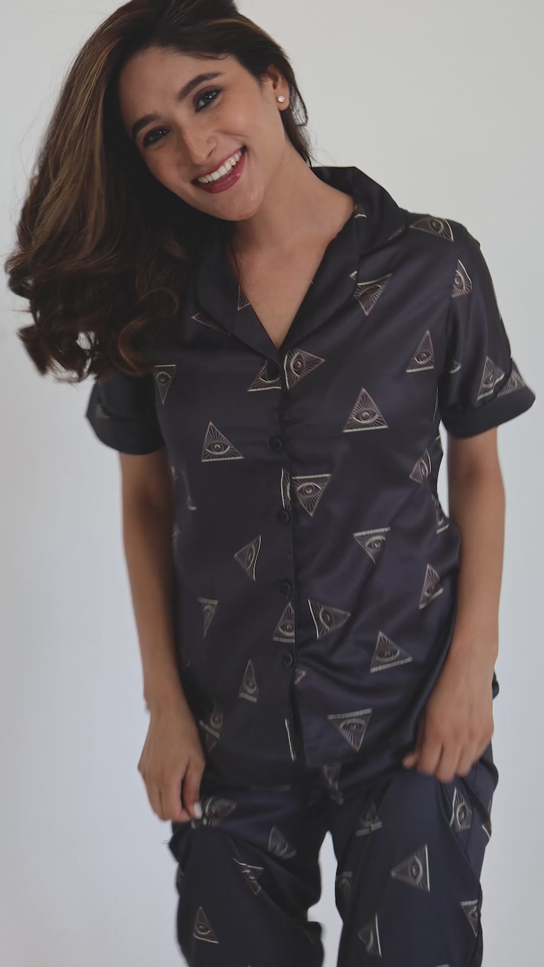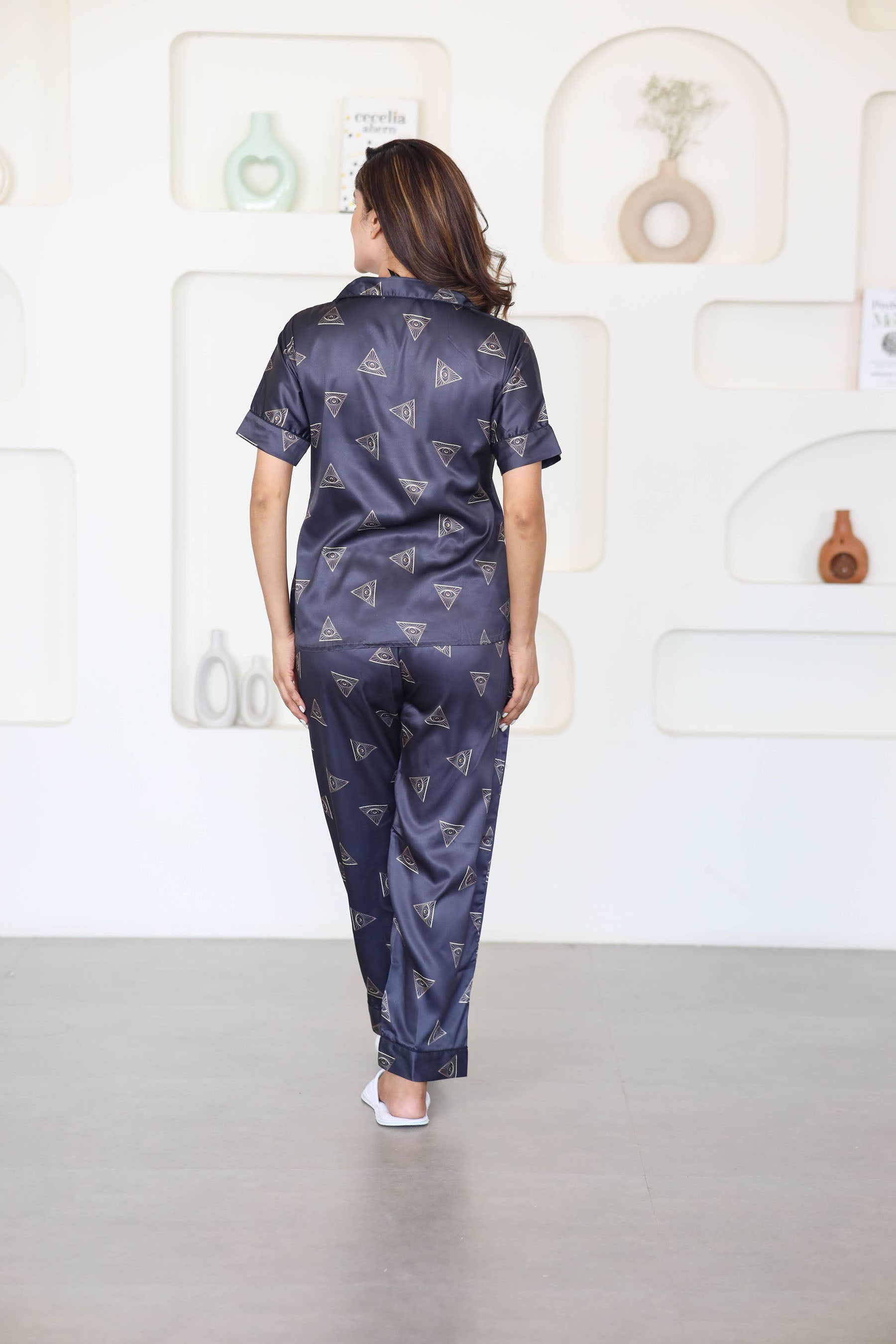 Women's Silk Satin Black Color Triangle Print Night Suit