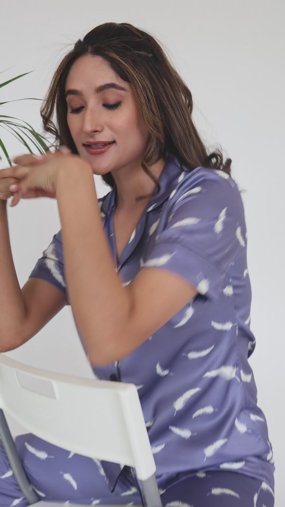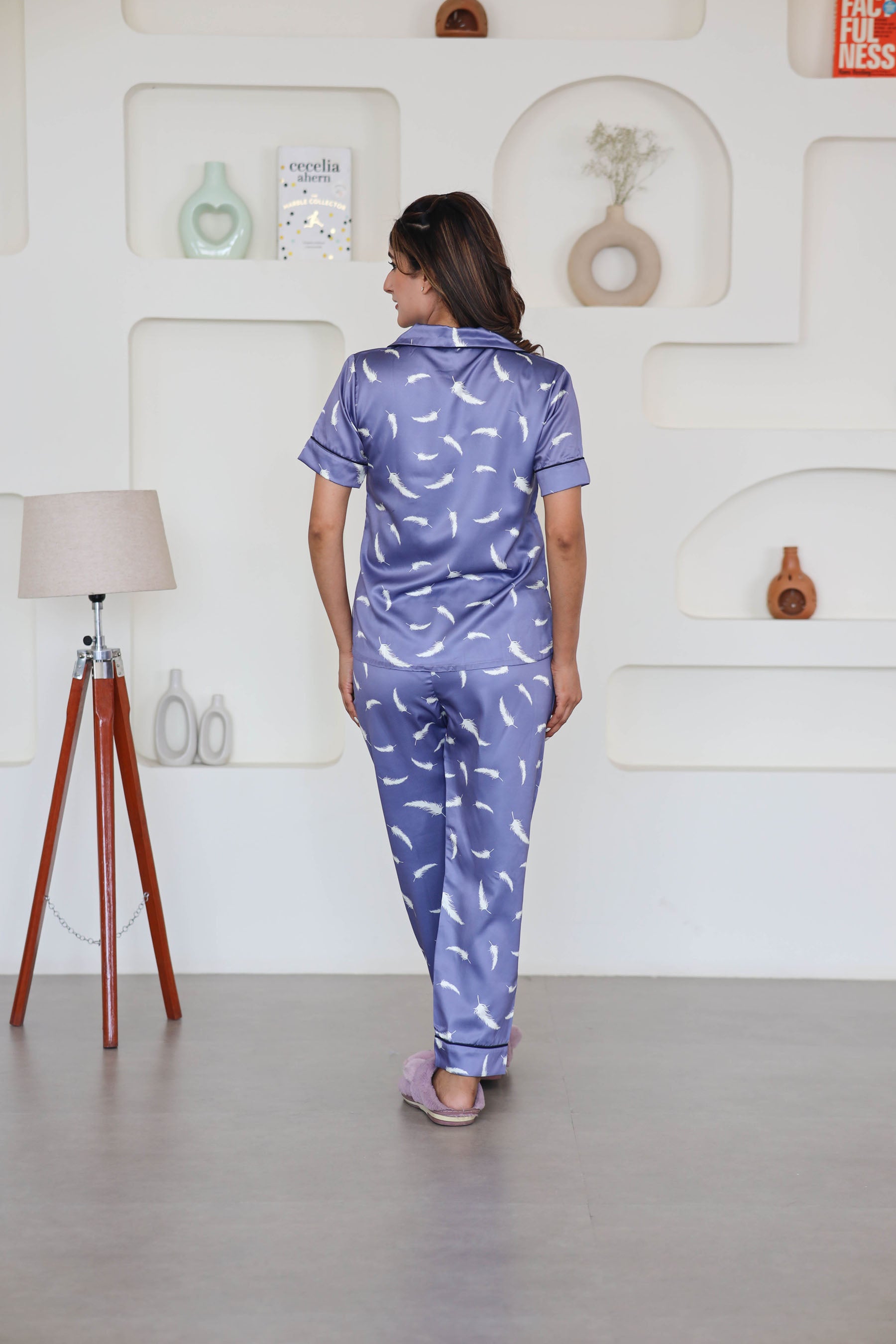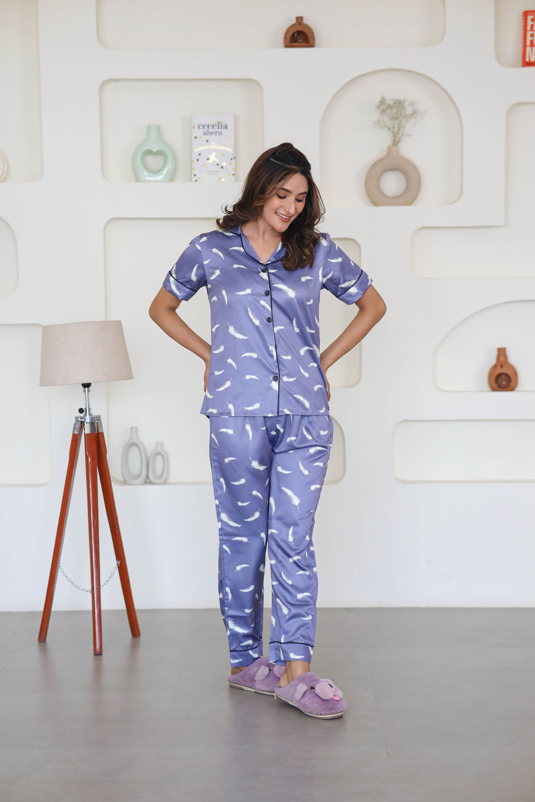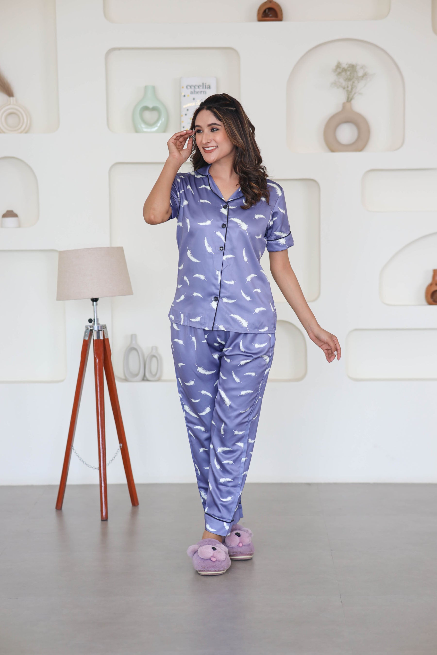 Women's Silk Satin Lavender Color Feather Print Night Suit