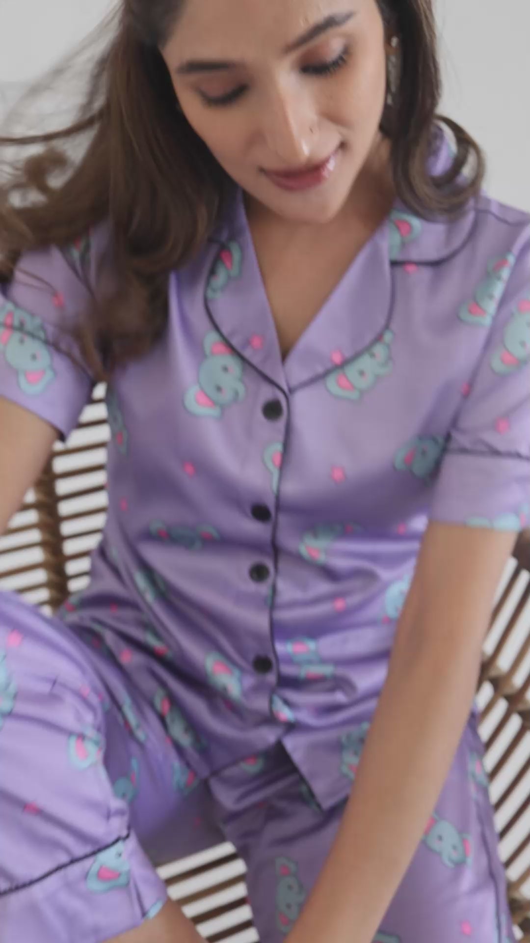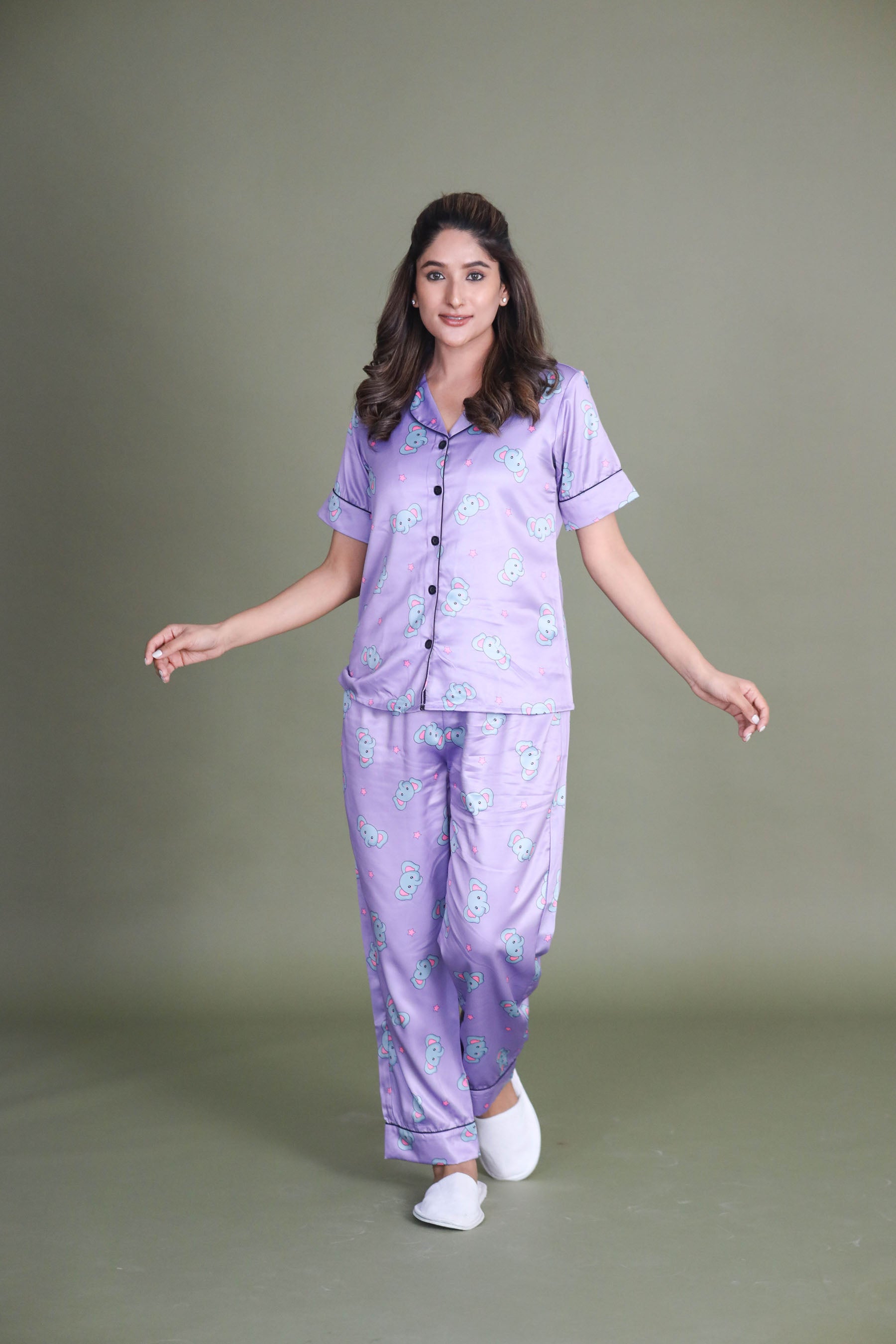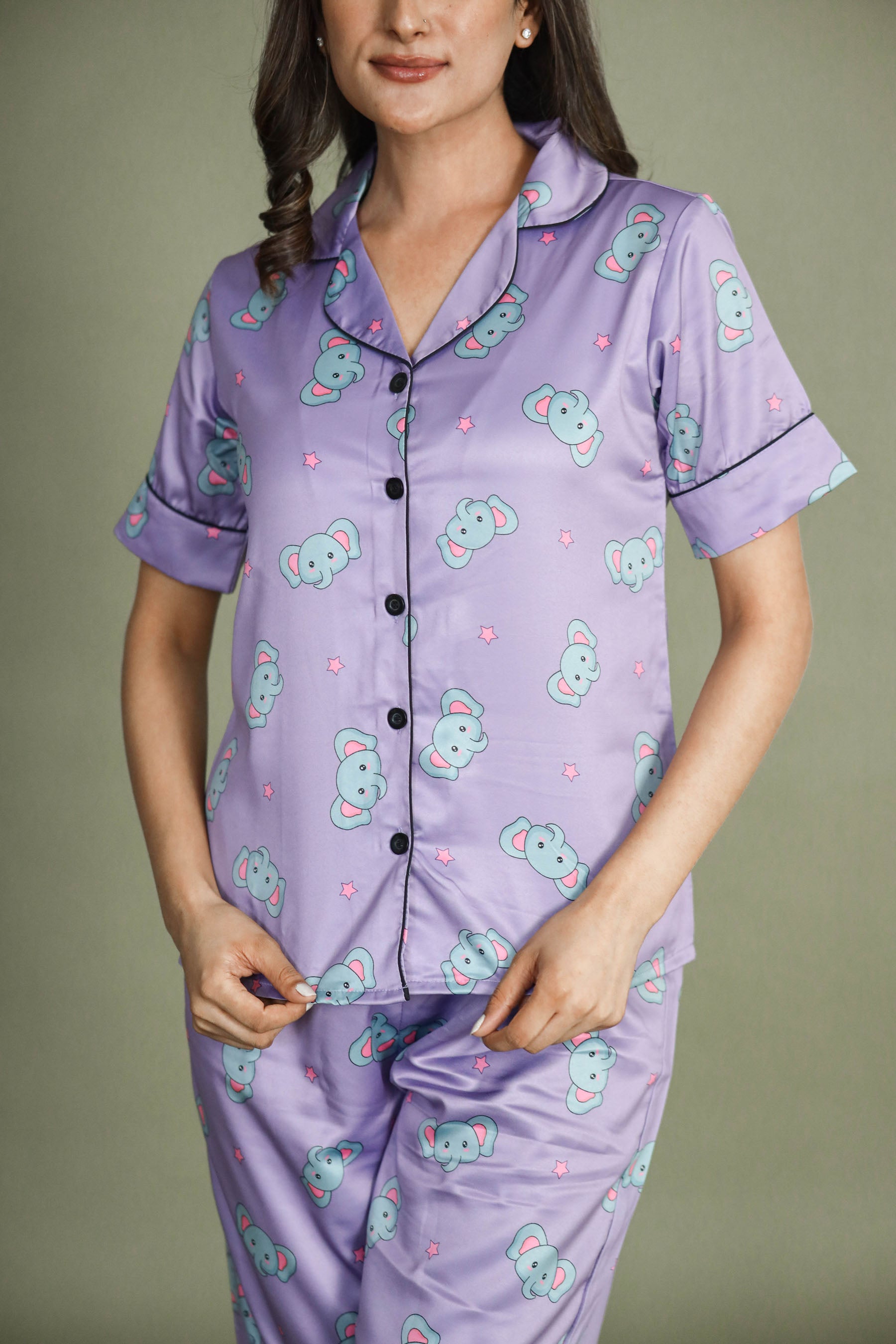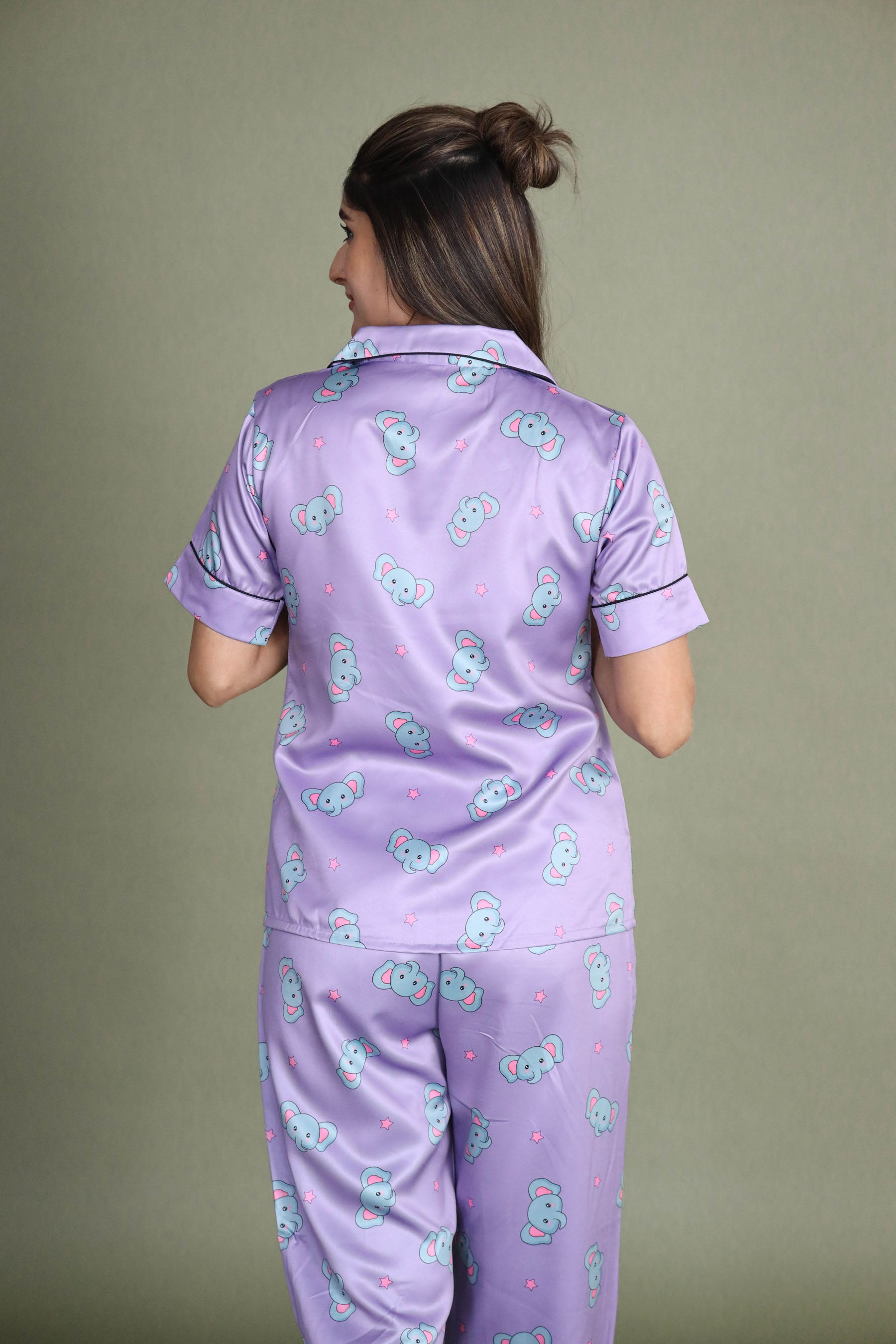 Women's Silk Satin Lilac Color Baby Elephant Print Night Suit