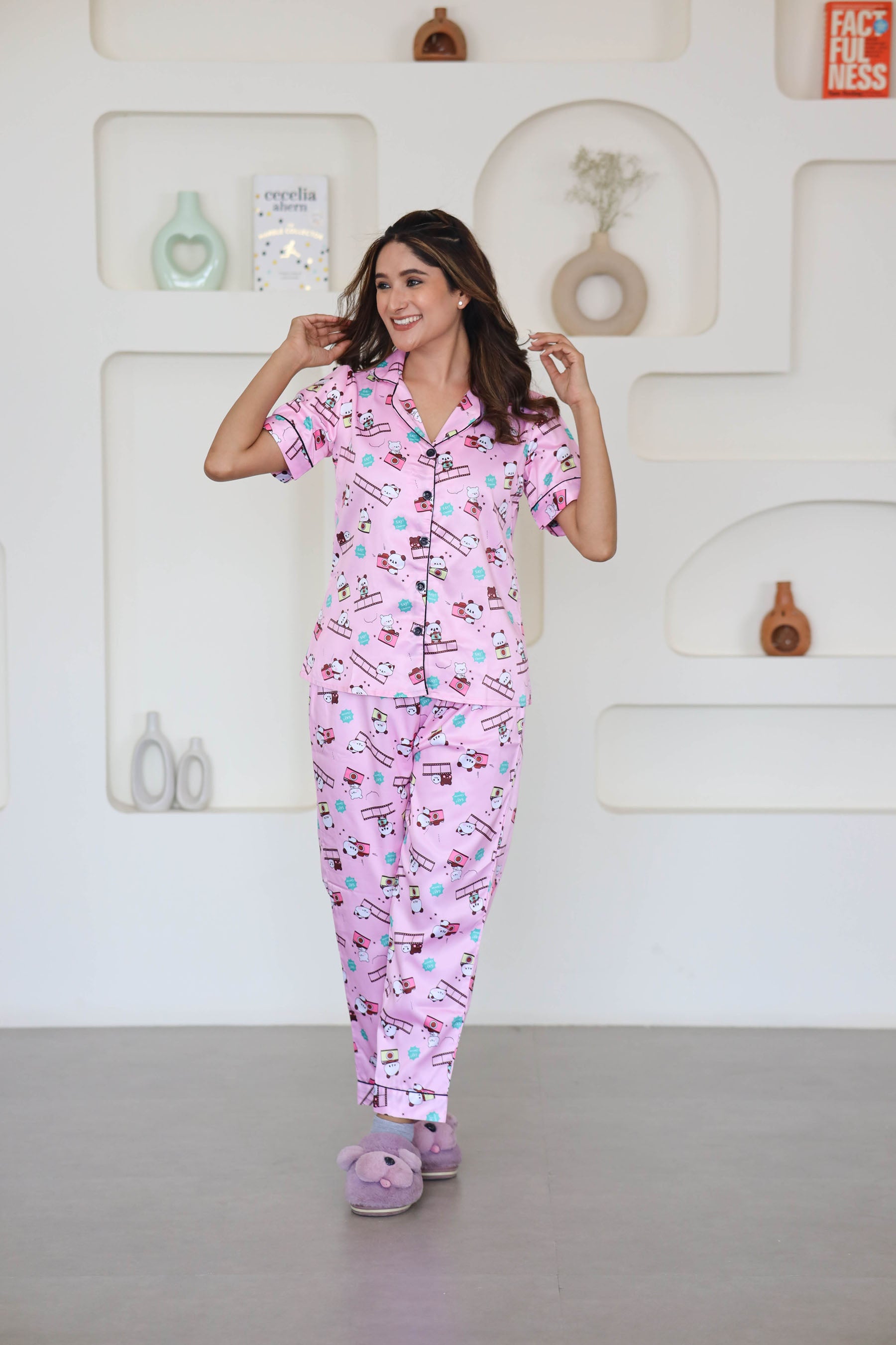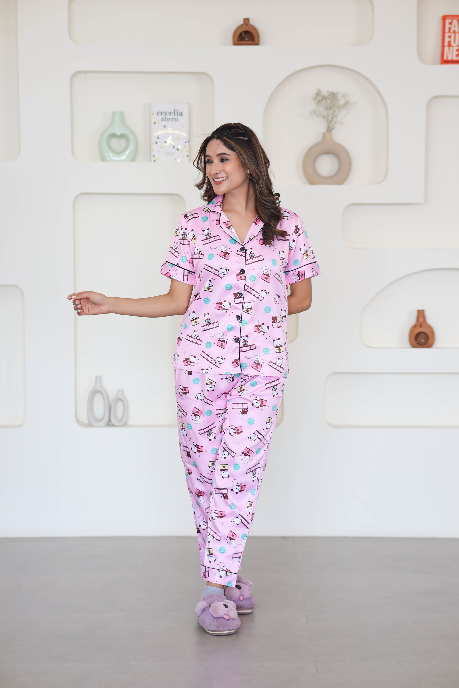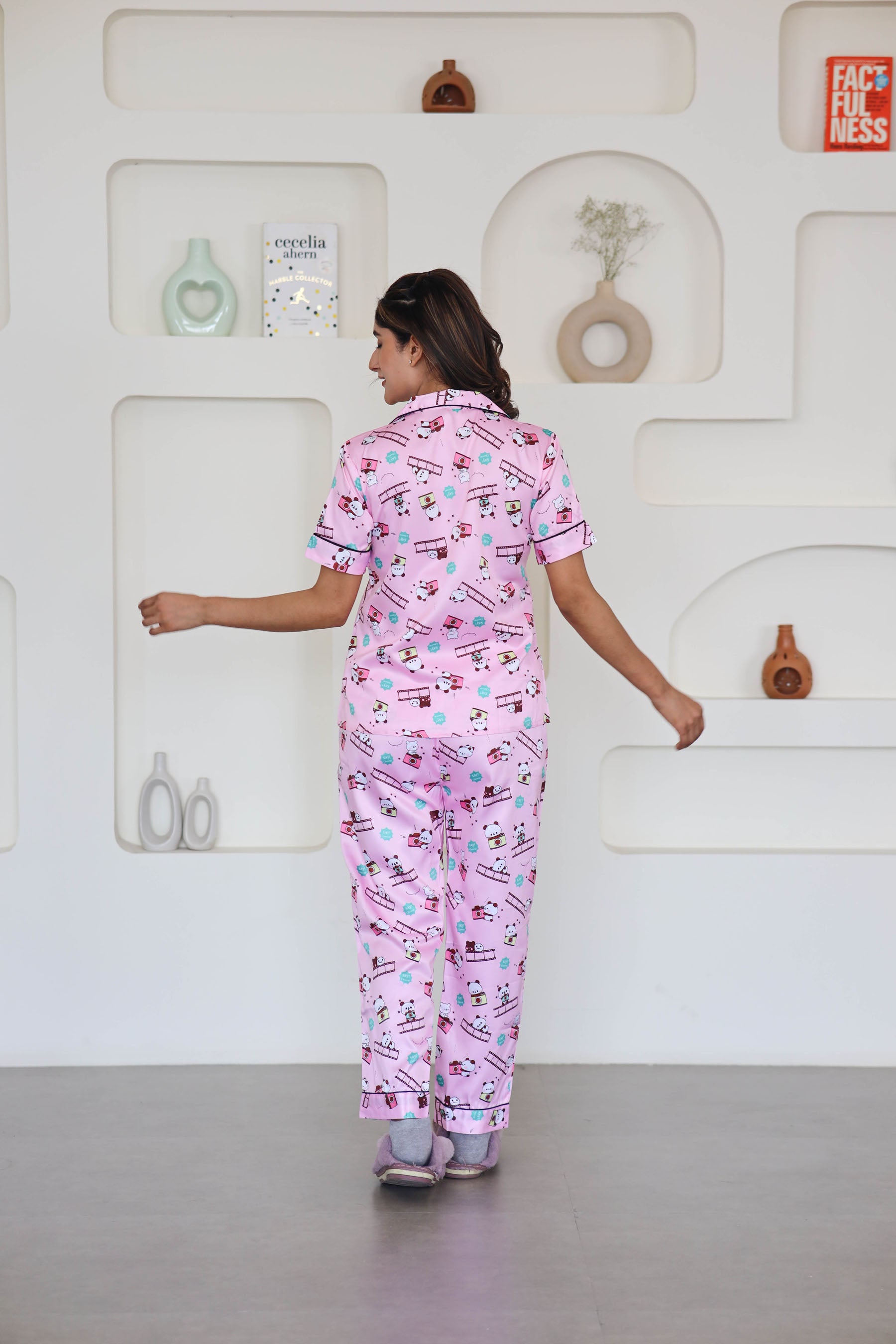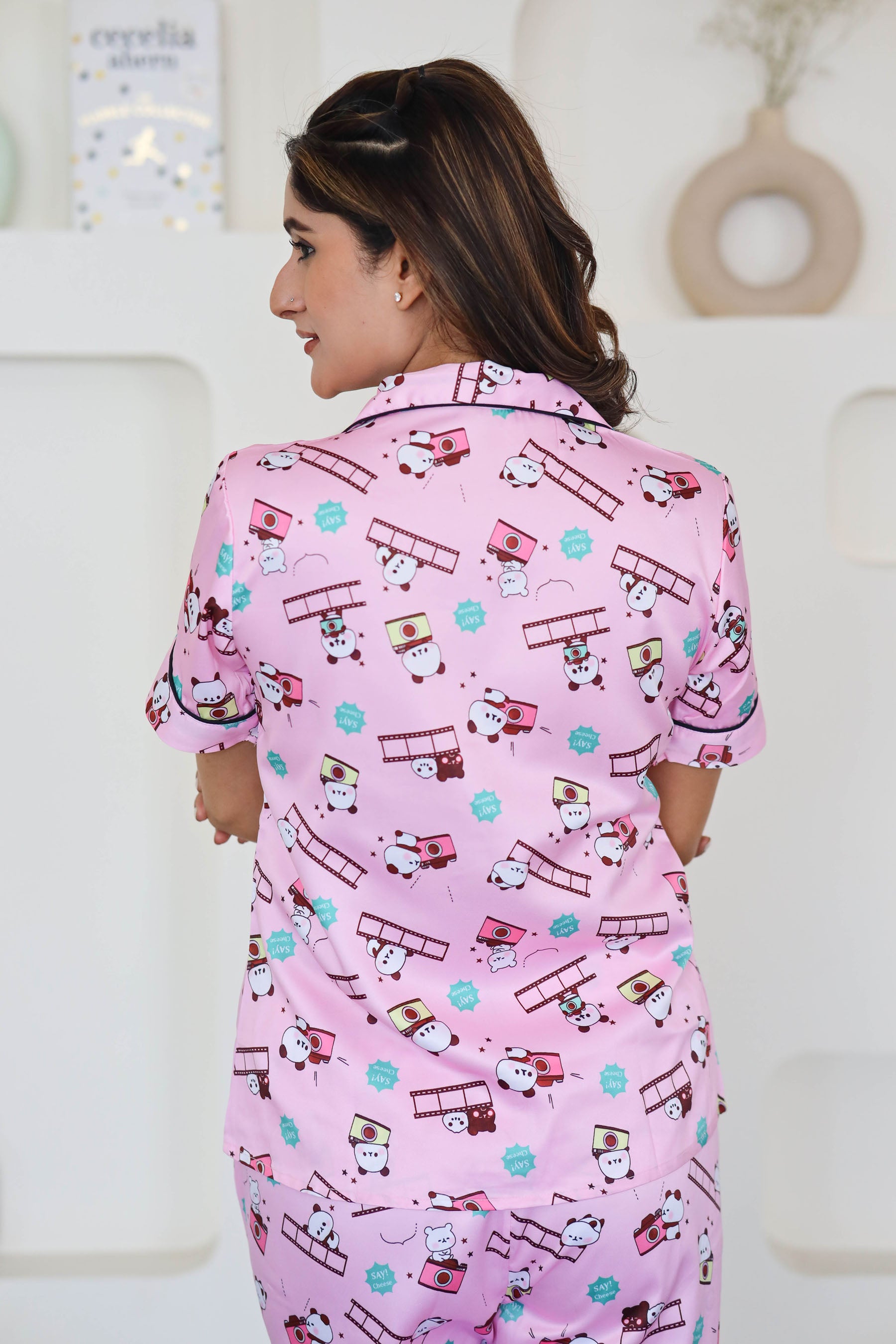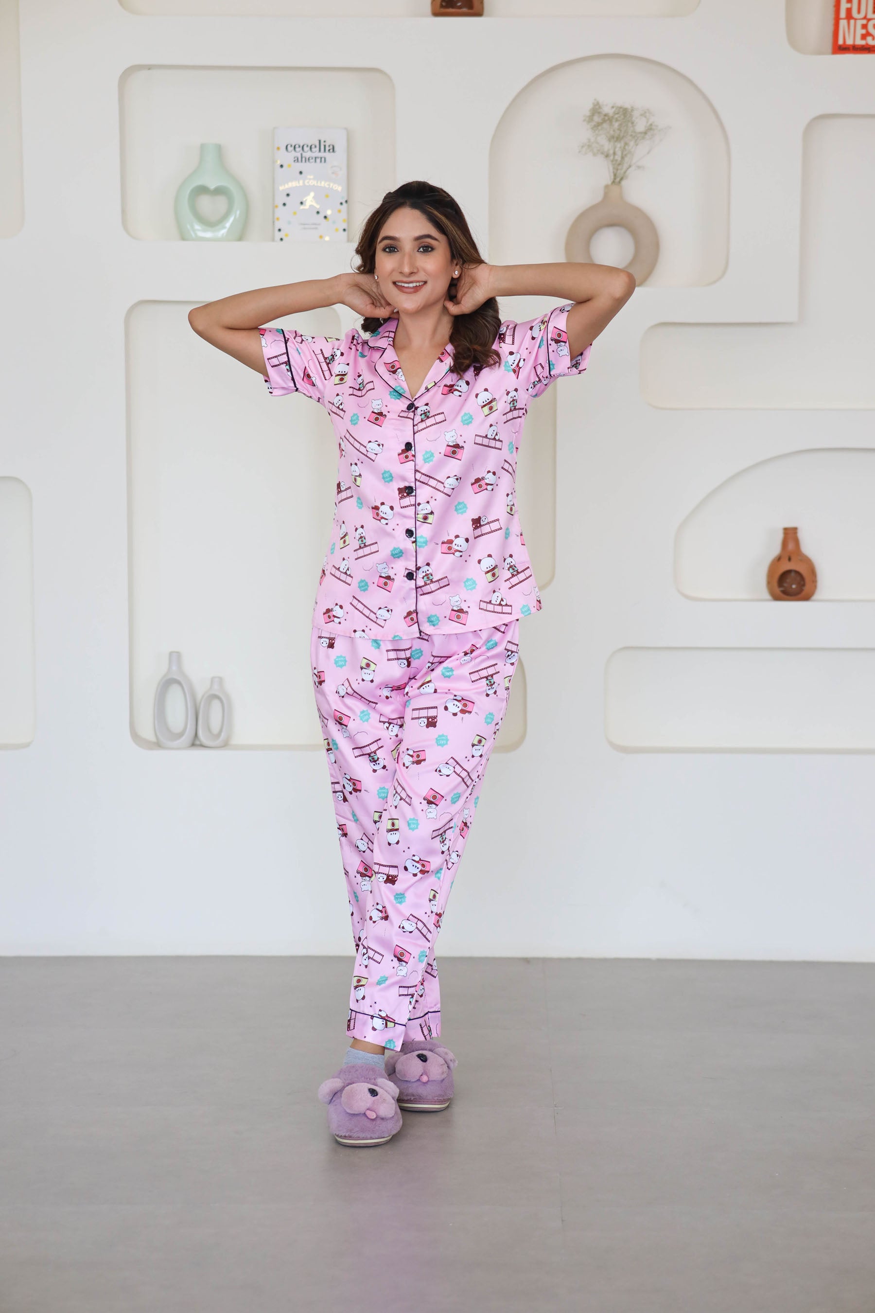 Women's Silk Satin Pink Color Teddy Bear Night Suit