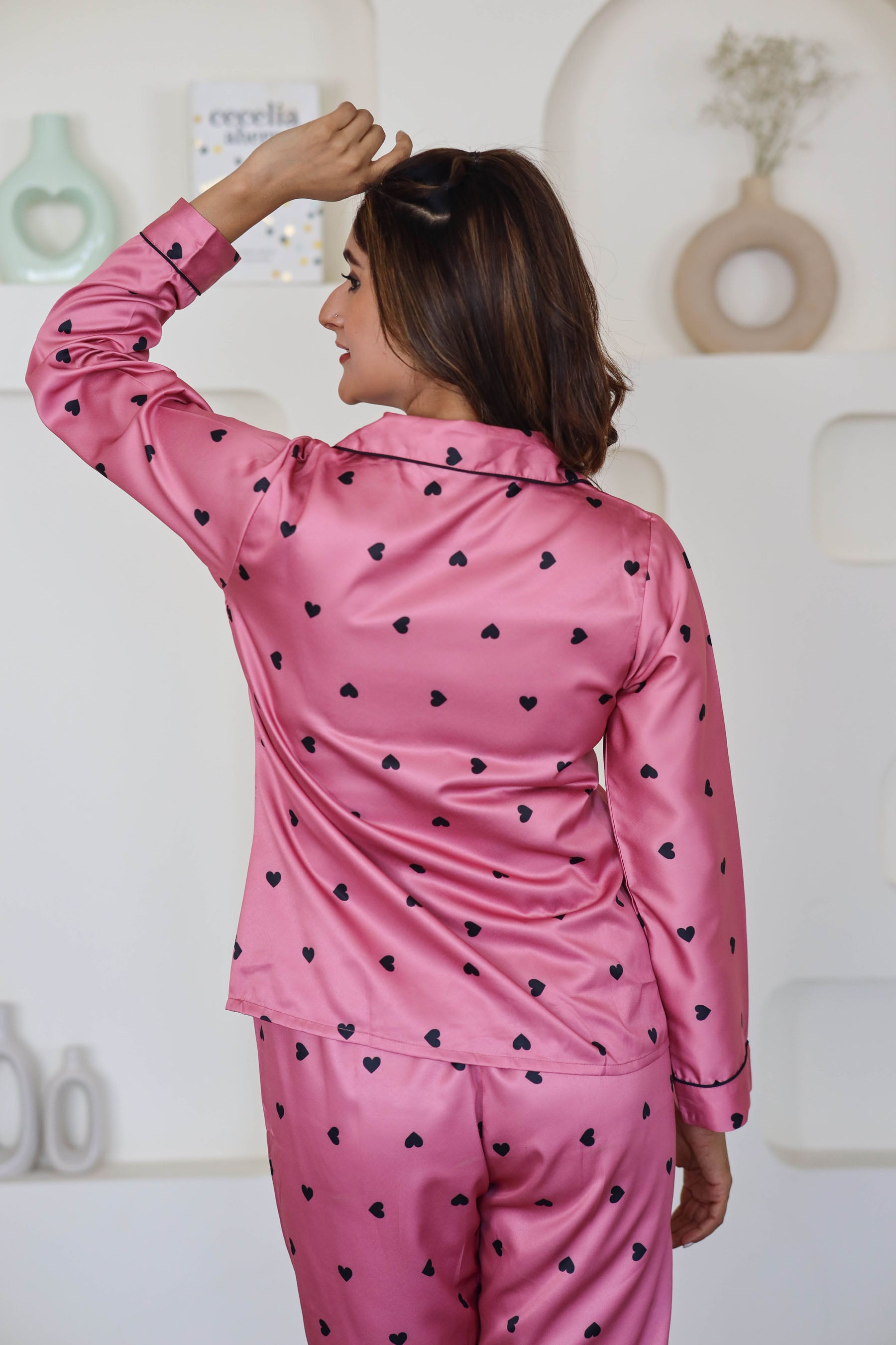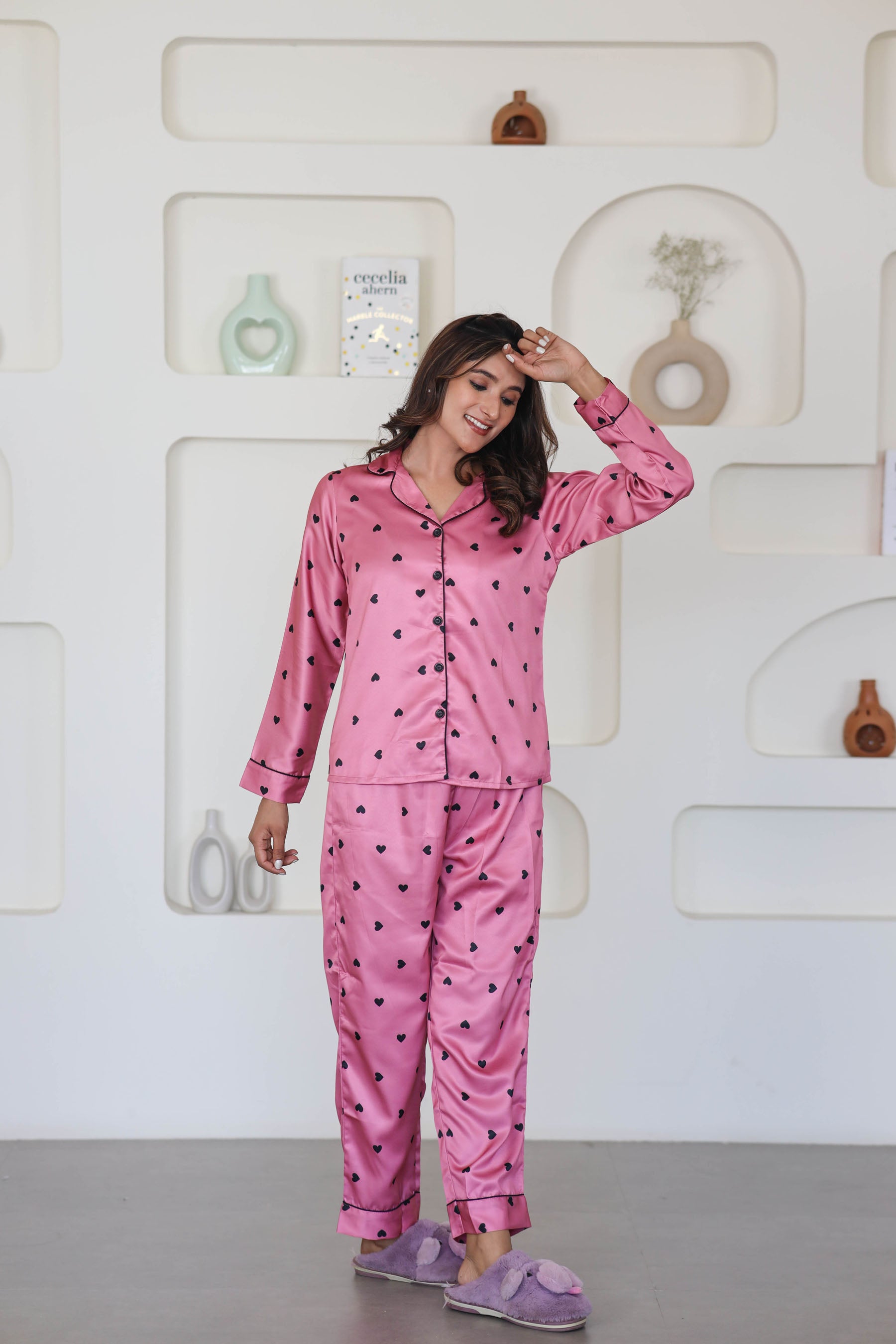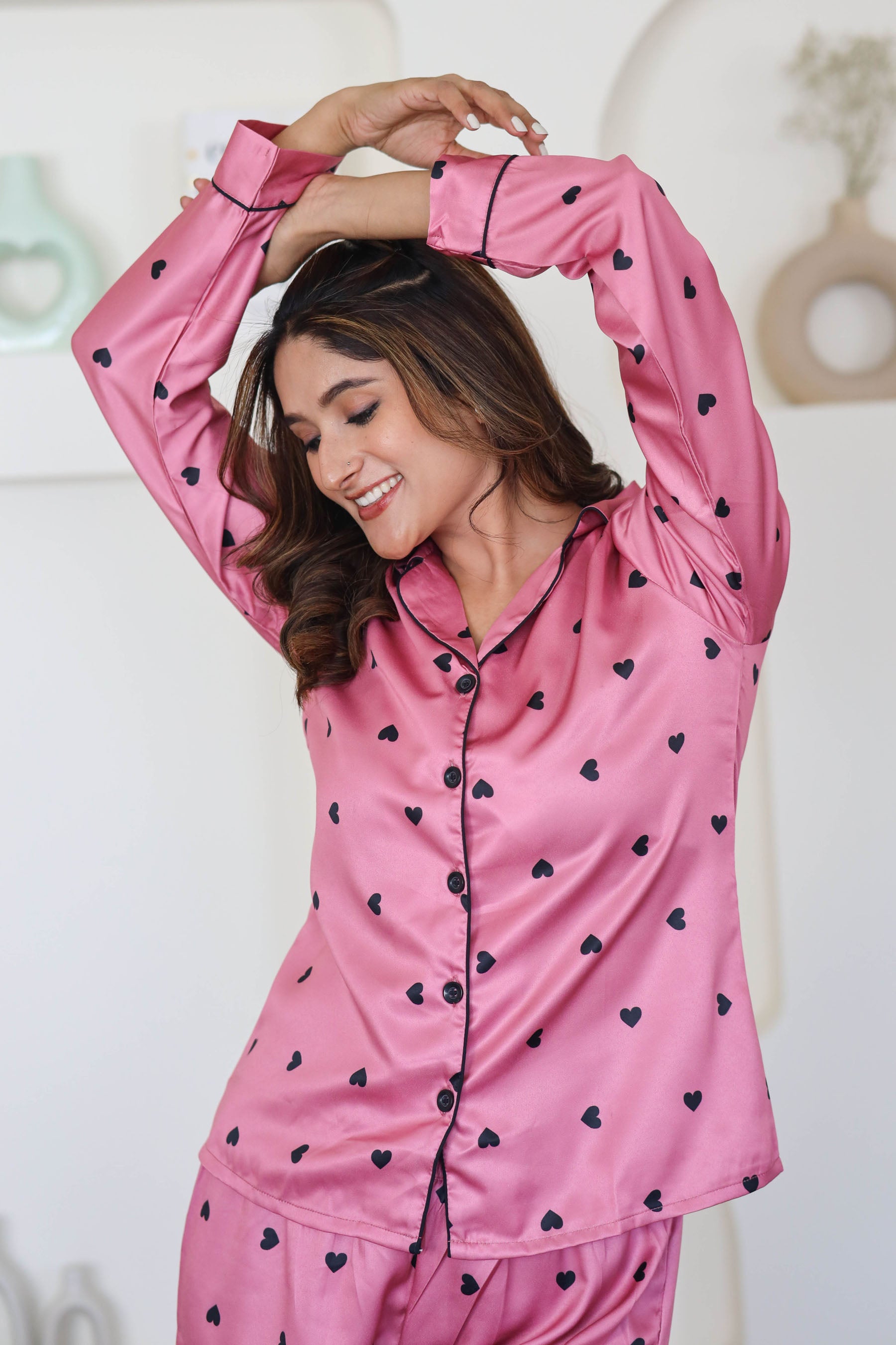 Women's Silk Satin Rose Gold Color Heart Print Full Sleeves Night Suit