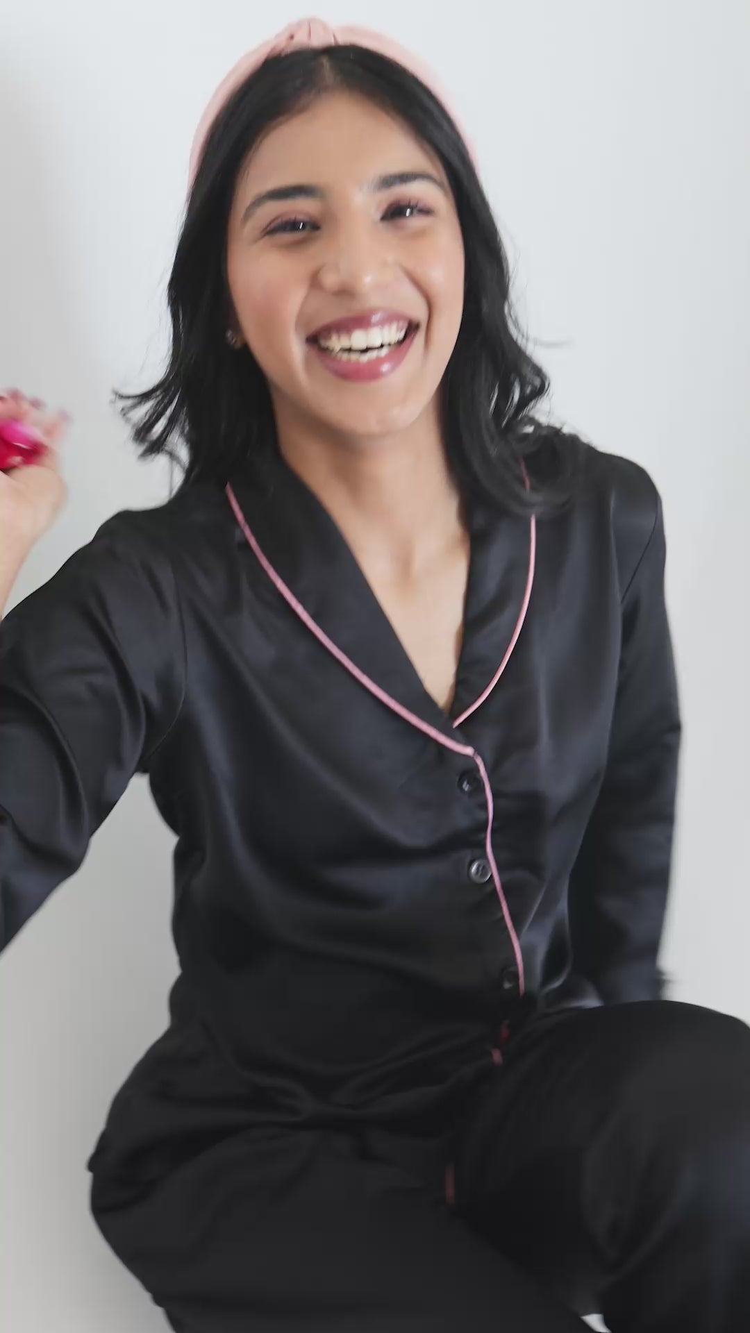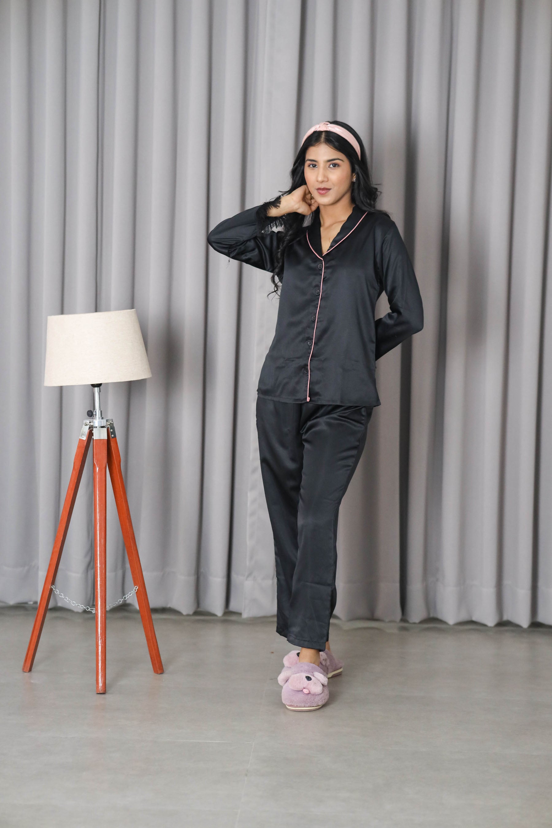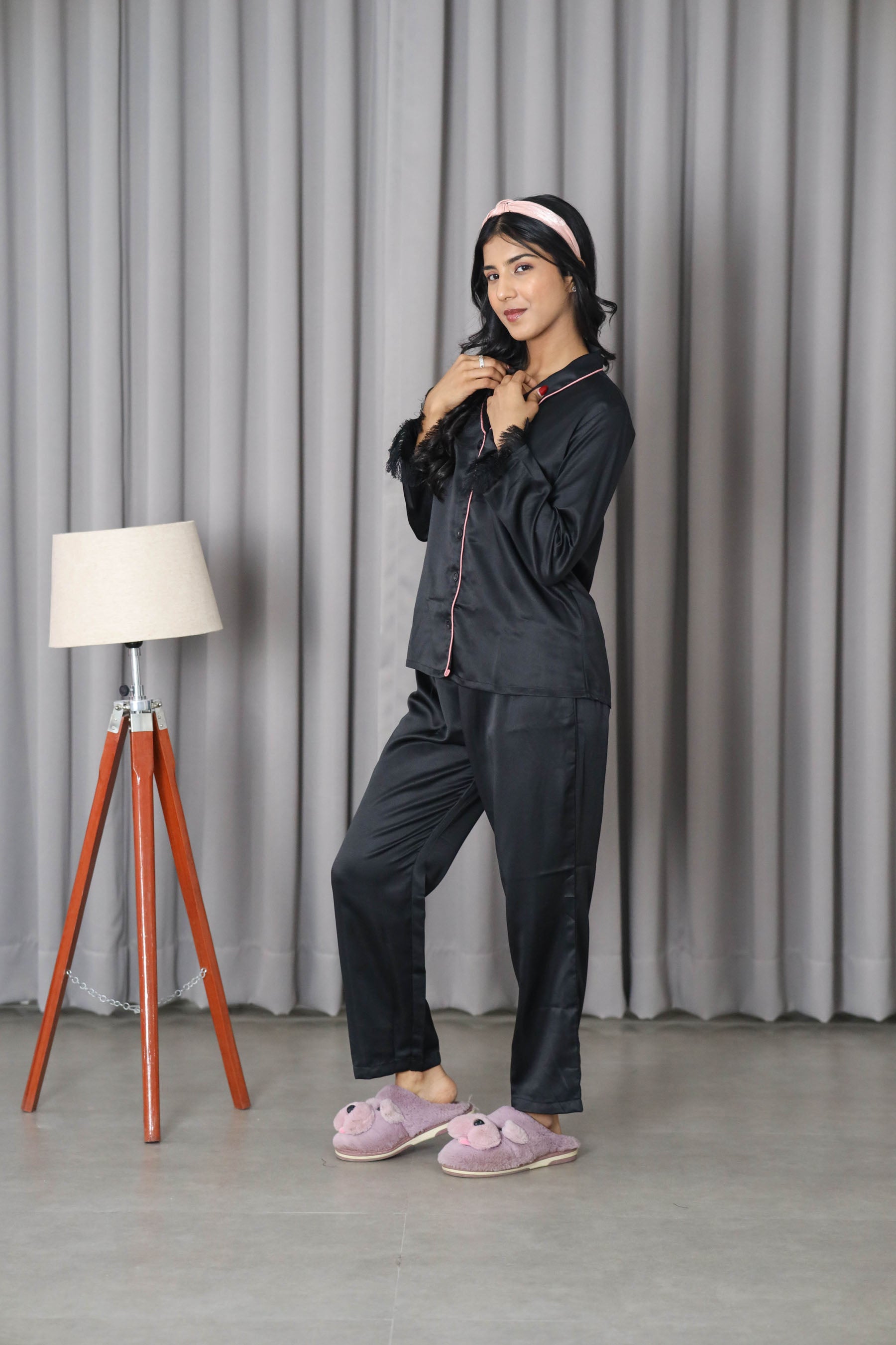 Women's Silk Satin Shawl Collar Black Color Fringed Night Suit Pair