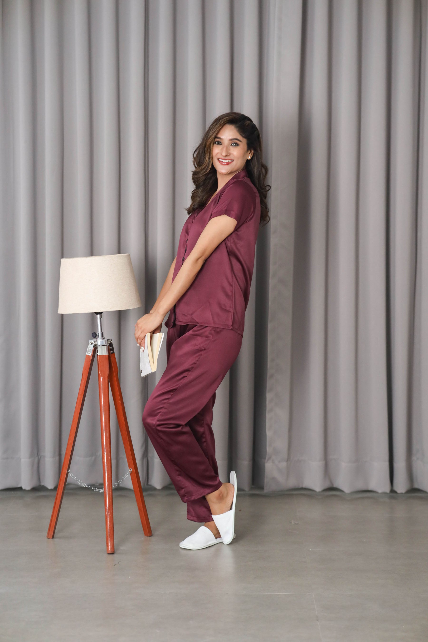 Women's Silk Satin Shawl Collar Wine Color Night Suit Pair