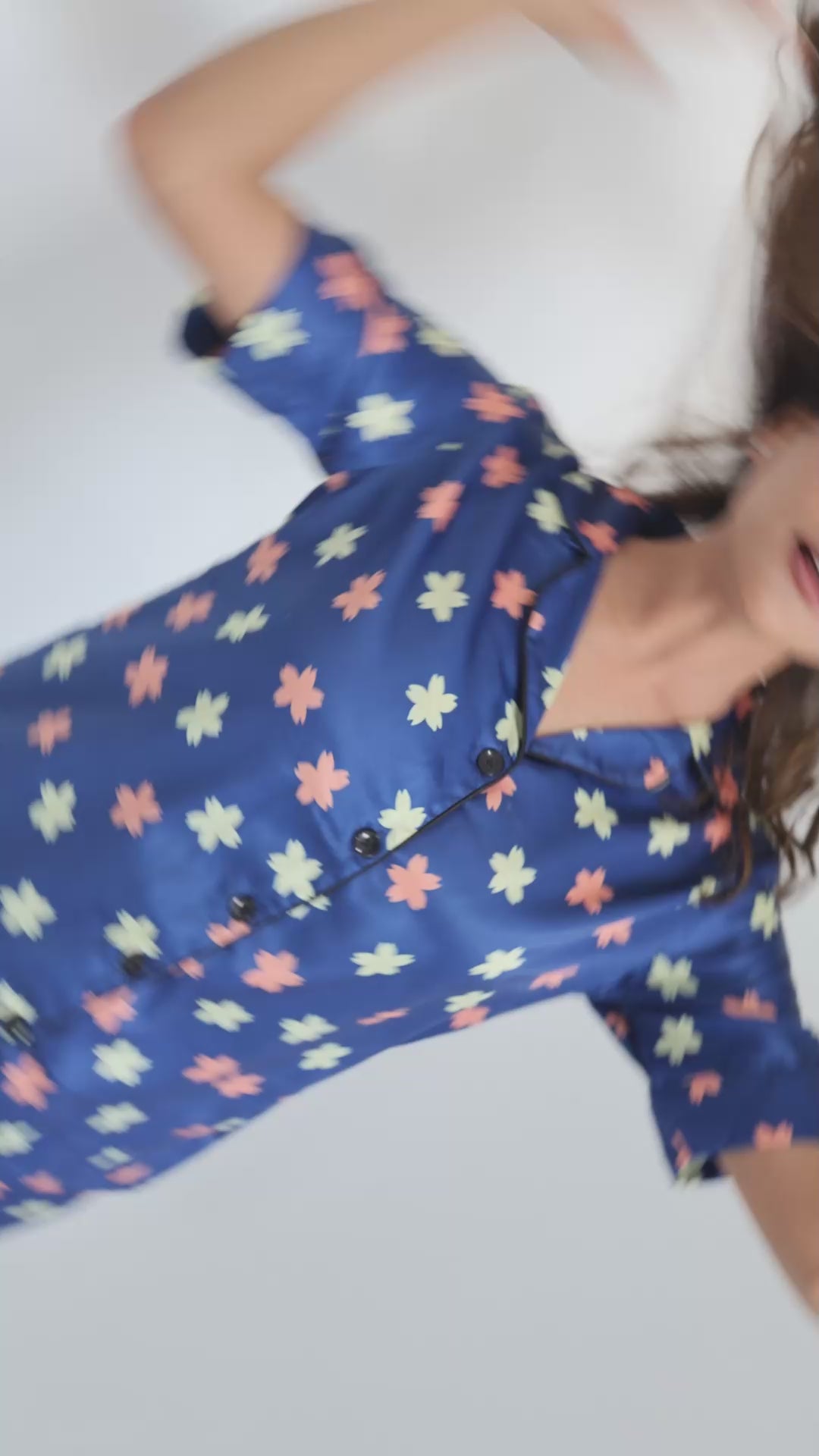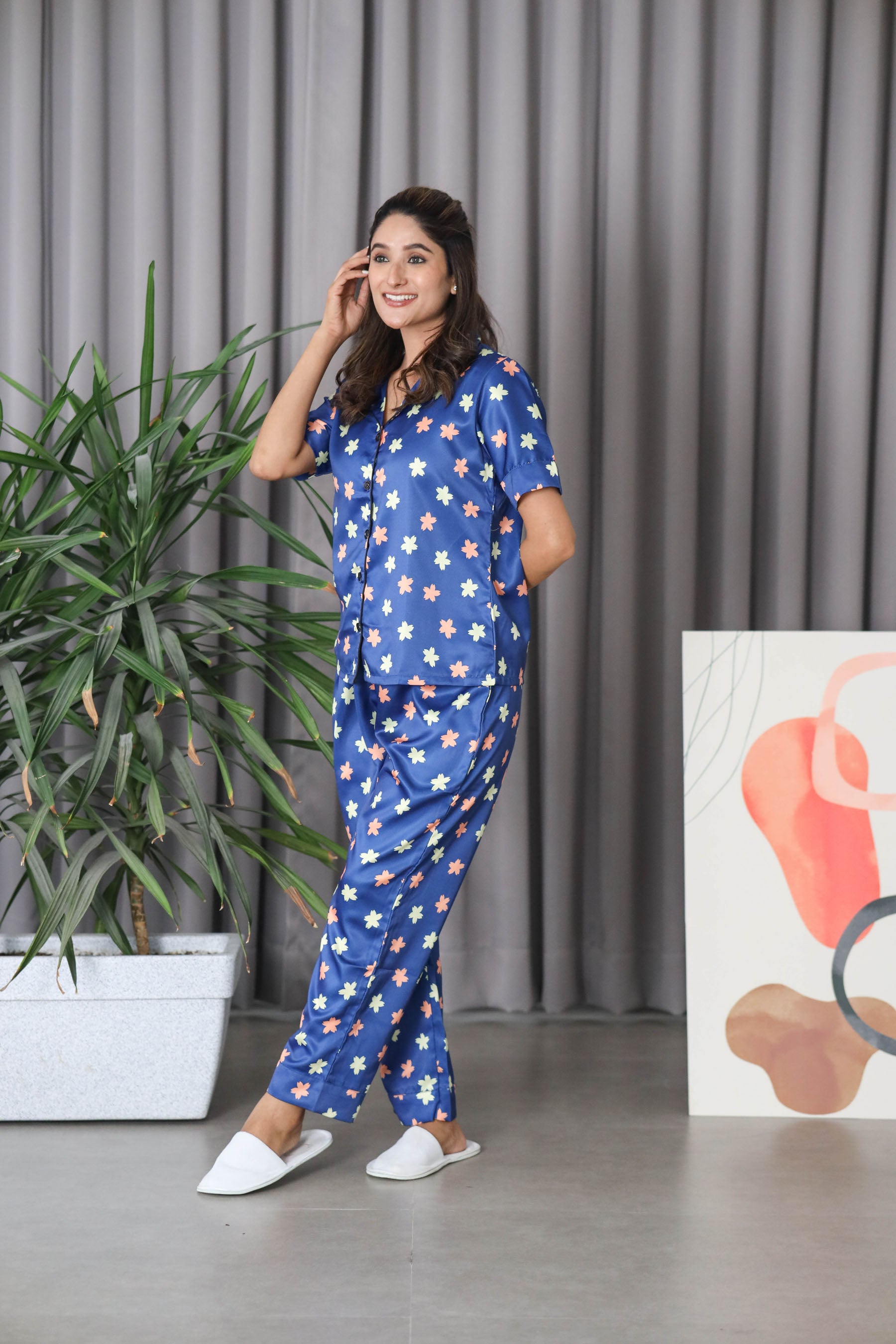 Women's Silk Satin Teal Blue Color Floral Print Night Suit