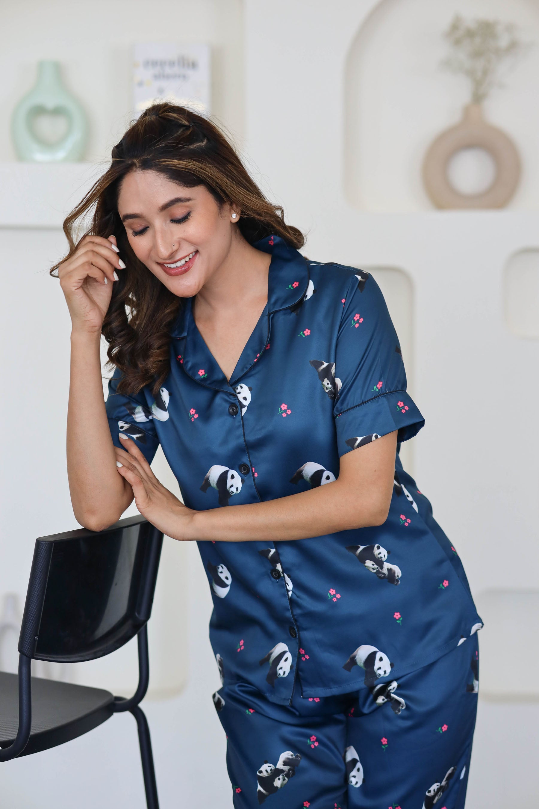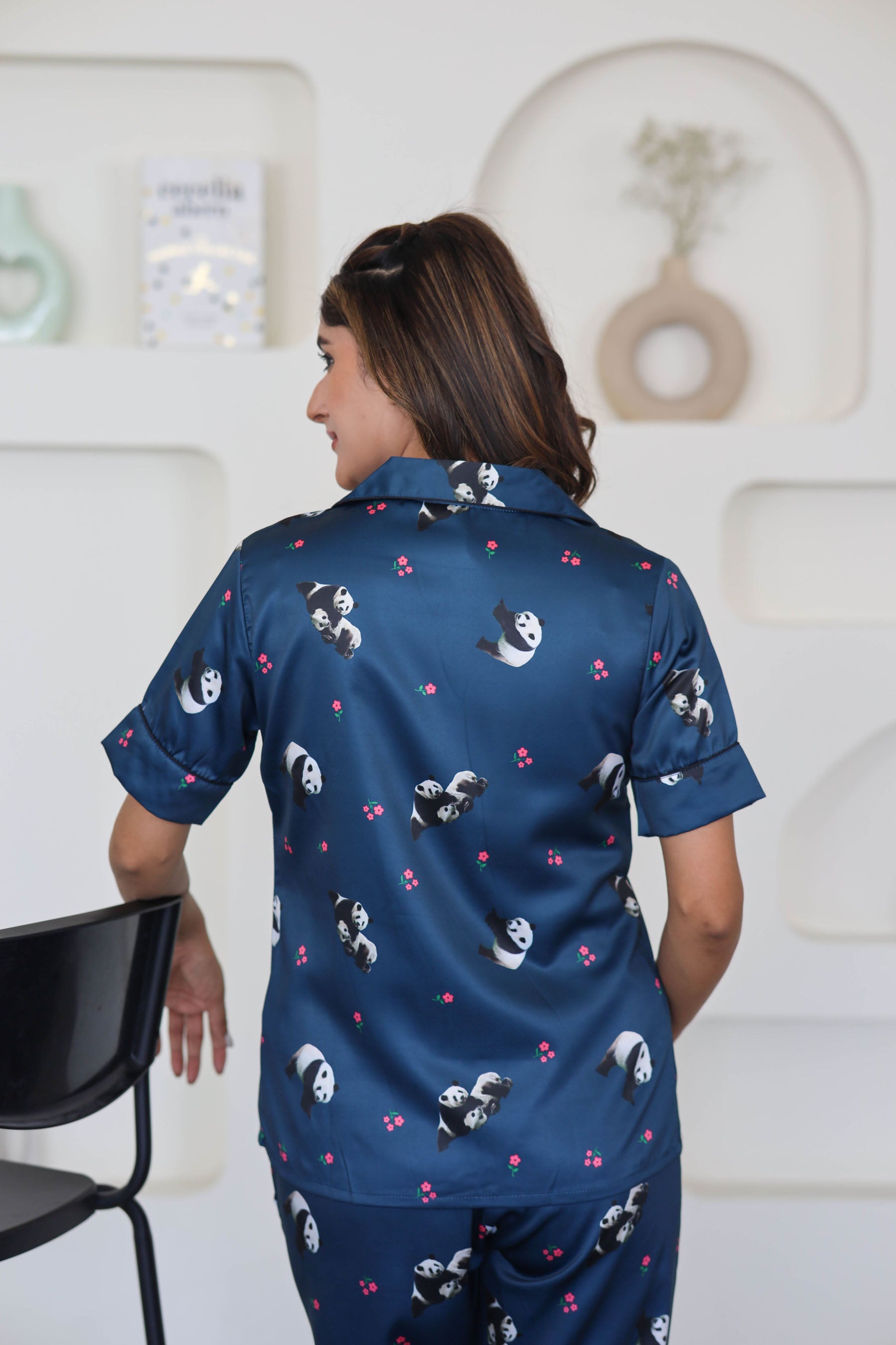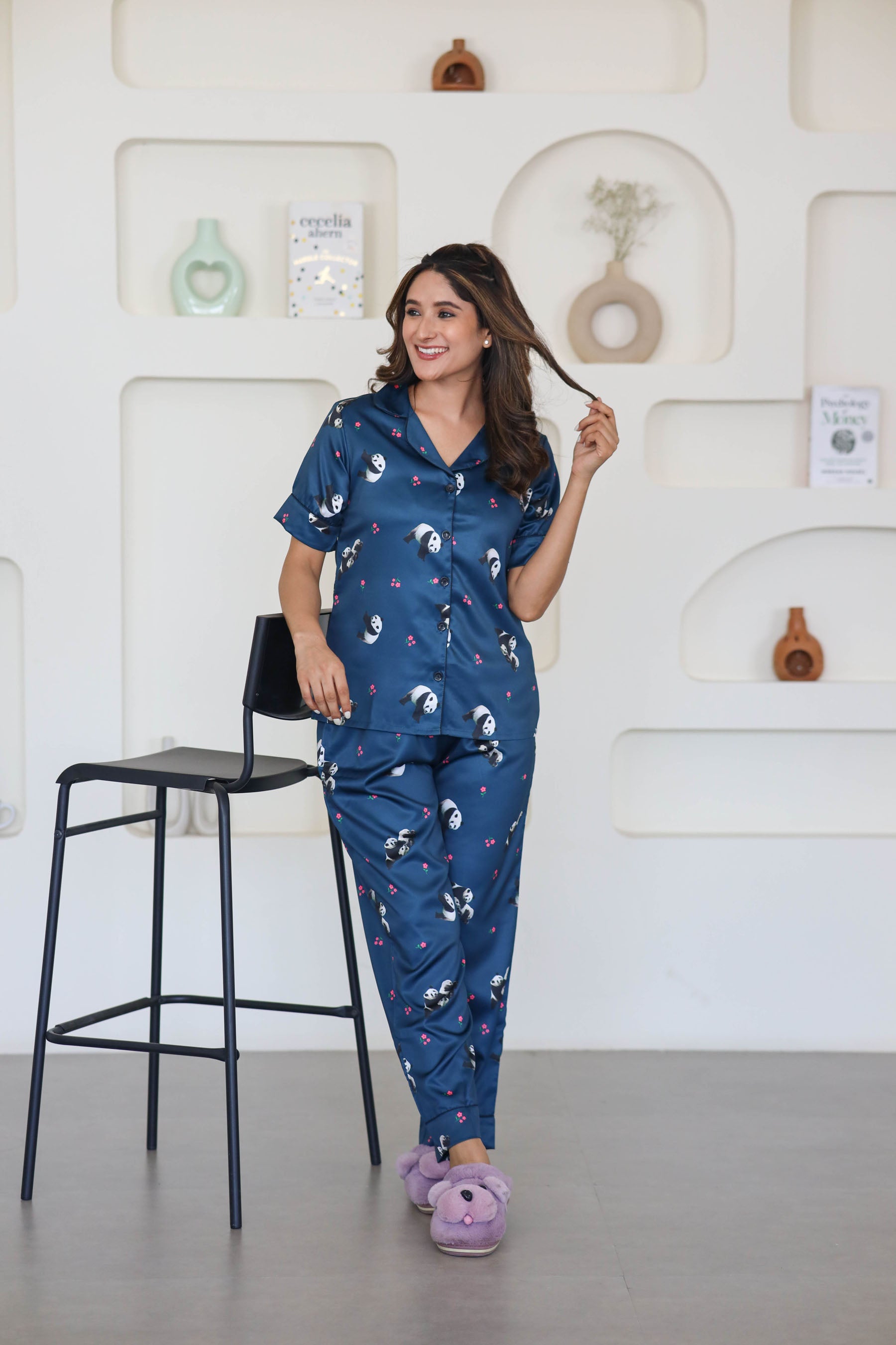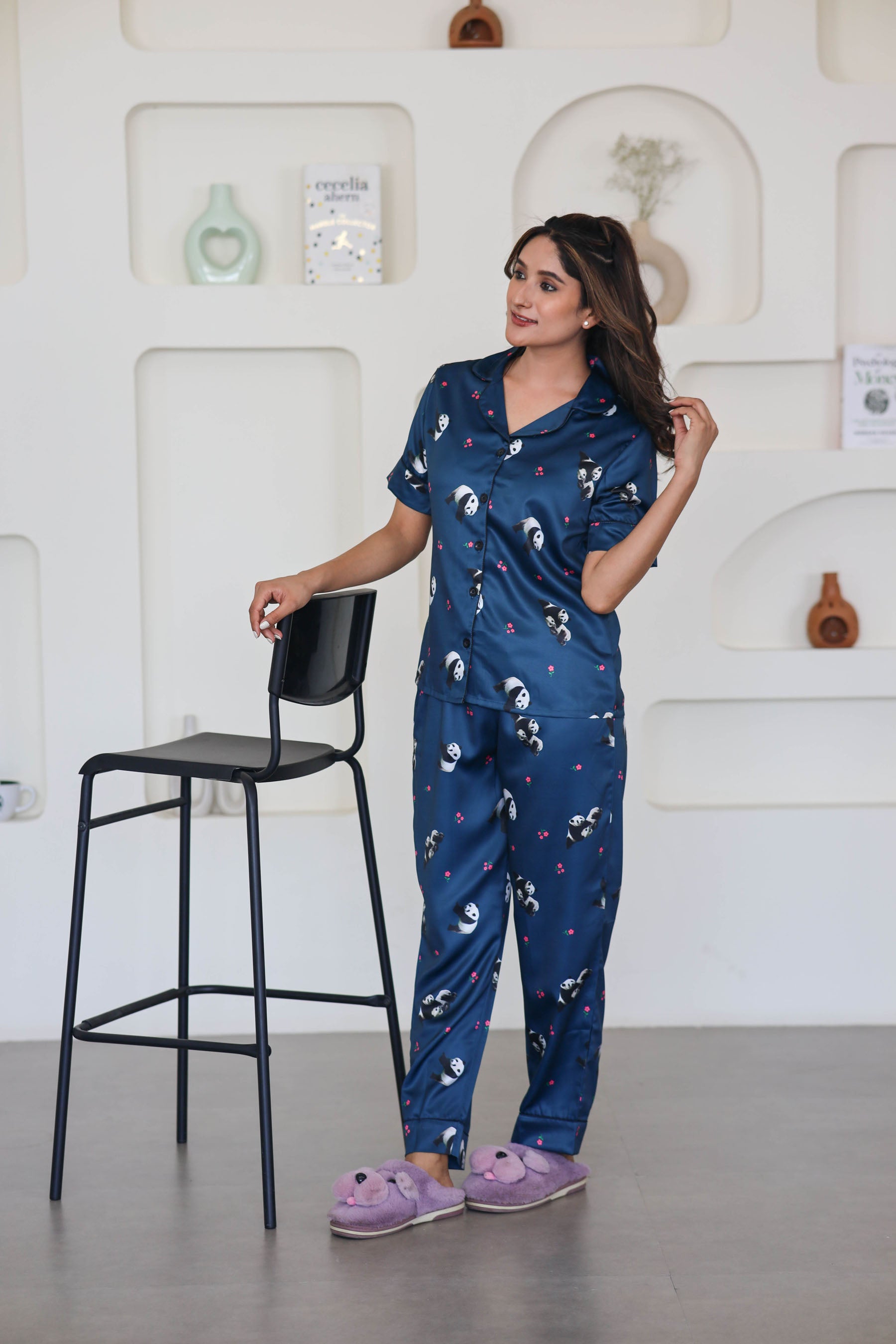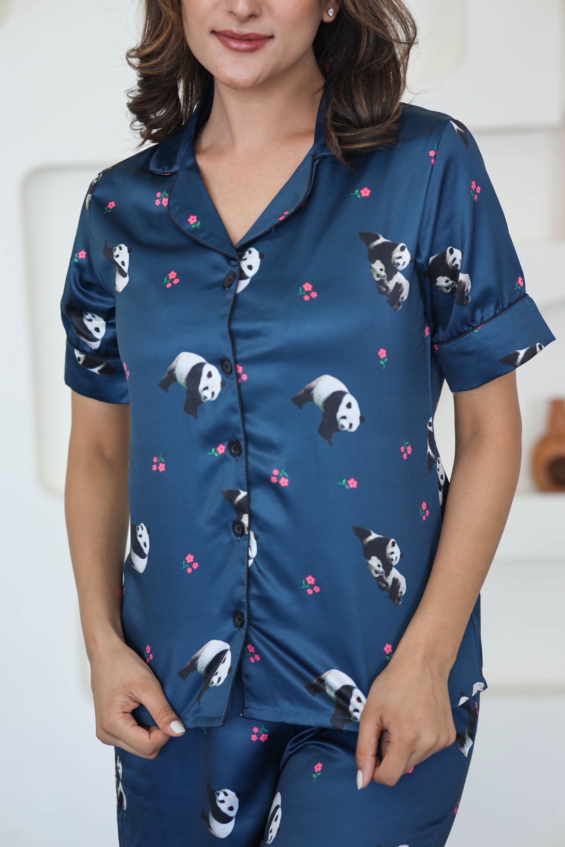 Women's Silk Satin Teal Blue Color Panda Print Night Suit