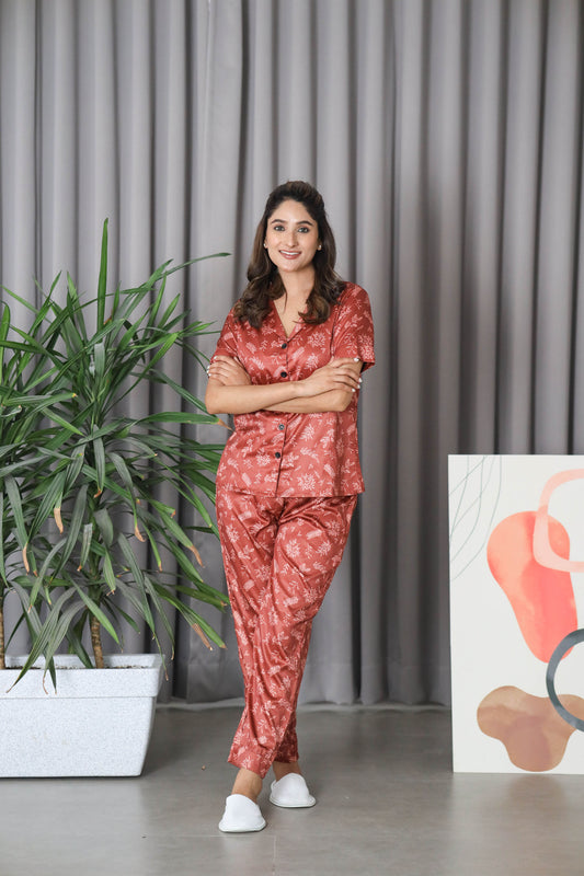 Women's Silk Satin Pastel Brown Color Floral Print Night Suit