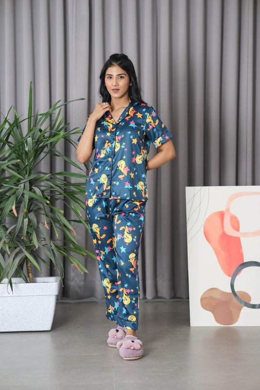 Women's Silk Satin Teal Blue Tweety Print Night Suit