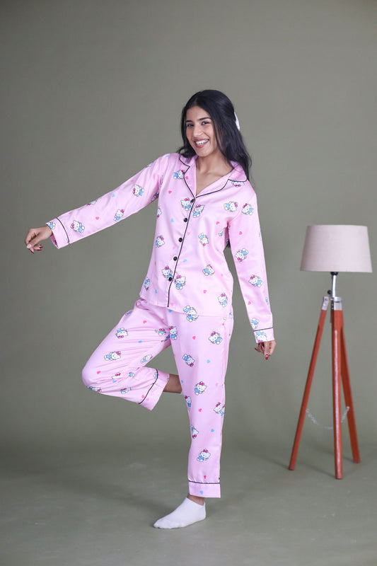 Women's Silk Satin Pastel Pink Color Hello Kitty Print Full Sleeves Night Suit