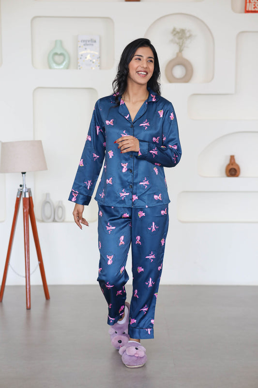 Women's Silk Satin Teal Blue Color Pink Panther Print Full Sleeves Night Suit