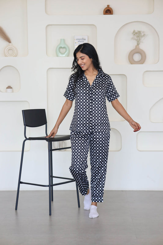 Women's Silk Satin Black & White Color Diamond Geometric Printed Night Suit
