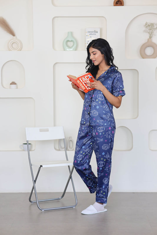 Women's Silk Satin Teal Blue Color Horoscope Printed Night Suit