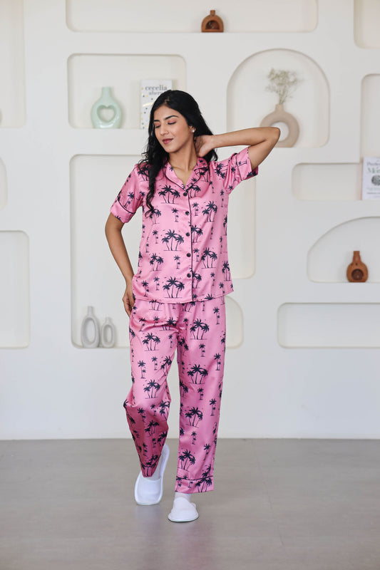 Women's Silk Satin Pink Color Palm Tree Printed Night Suit