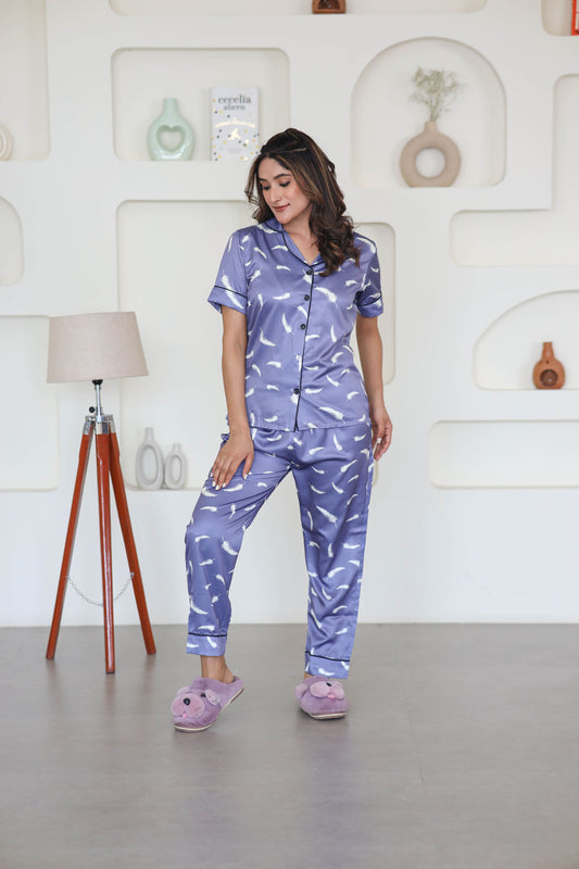 Women's Silk Satin Lavender Color Feather Print Night Suit